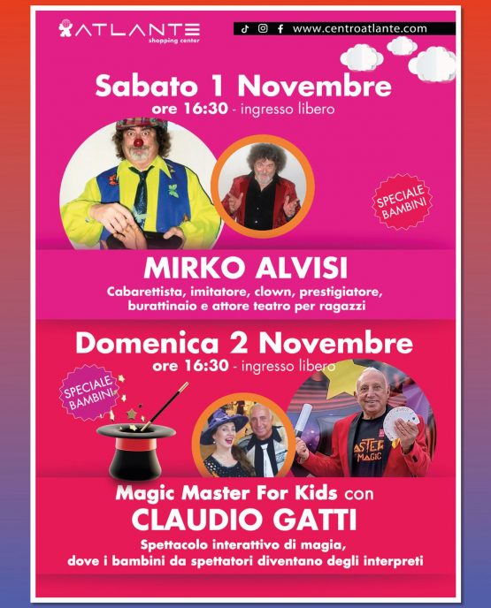 Domenica 2 Novembre alle ore 16:30 sarà la volta del coinvolgente spettacolo Magic Master For Kids con Claudio Gatti, dove i bambini diventano protagonisti partecipando attivamente ai numeri di magia.