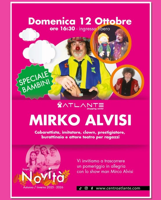 Domenica 12 Ottobre, a partire dalle 16:30, Mirko Alvisi – cabarettista, imitatore, clown, prestigiatore e attore teatrale – sarà protagonista di uno spettacolo indimenticabile.